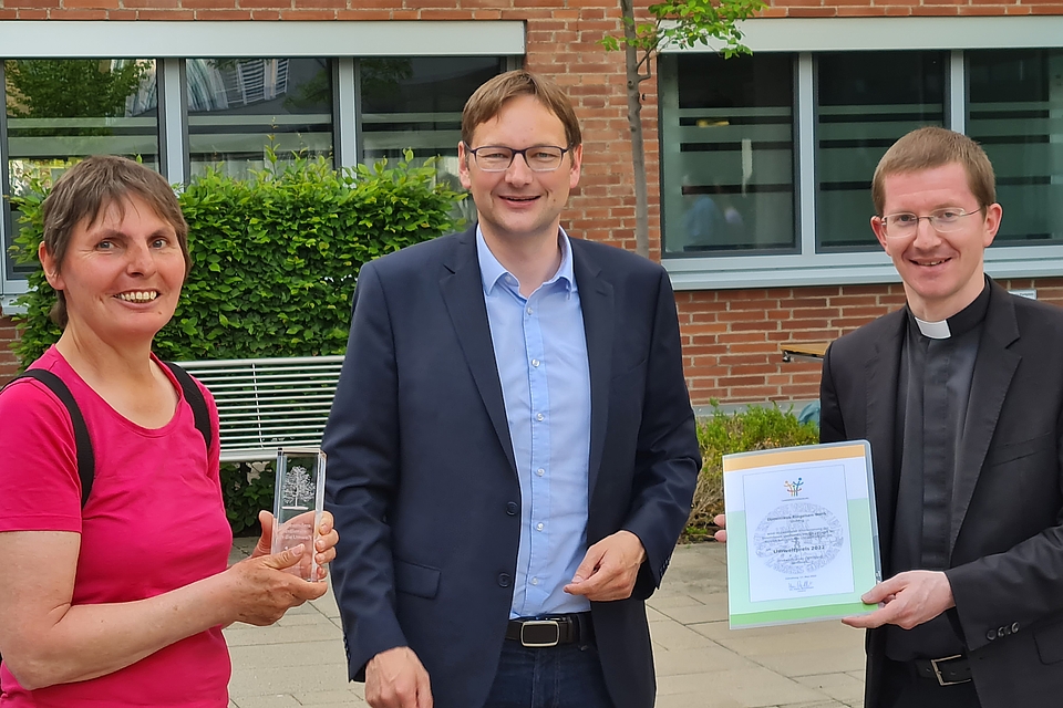 Günzburg/Ursberg / 18. Mai 2022 - Das Dominikus-Ringeisen-Werk hat den Umweltpreis 2022 des Landkreises Günzburg erhalten. Übergeben wurde die Auszeichnung von Landrat Dr. Hans Reichhart bei einer kleinen Zeremonie im Innenhof des Landratsamts in Günzburg. Das DRW wurde für sein "gesamtheitliches Handeln im Hinblick auf Nachhaltigkeit, Ökologie und Umweltschutz" ausgezeichnet. Außerdem erhielten den Preis das Projekt „Herzgrün Günzburg“ sowie das Gemeinschaftsprojekt „Naturerlebnispfad Schlosspark Autenried“.