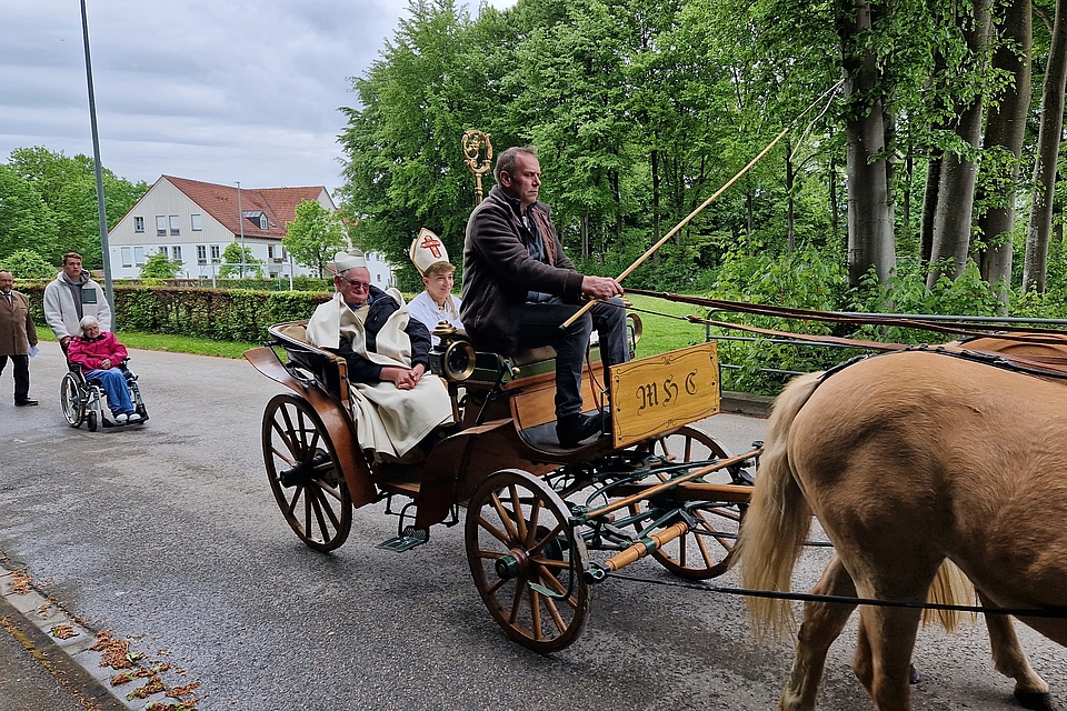 Um die Geschichte auch 900 Jahre später erlebbar zu machen, hatten sich die Organisatoren um den Roggenburger Prämonstratenser und Schulseelsorger Pater Christian Hamberger etwas Besonderes ausgedacht: In einer Kutsche ließen sie Norbert von Xanten, gespielt von Schüler Leo Rothermel, auffahren. Begleitet wurde er von über 60 Ministrantinnen und Ministranten des Ringeisen-Gymnasiums, zahlreichen Geistlichen und einem mittelalterlichen Herold hoch zu Ross. Eine besondere Ehre wurde Josef Kerscher zuteil. Er lebt seit vielen Jahren in Ursberg und durfte anlässlich seines 75. Geburtstags als Prämonstratenser-Mönch verkleidet in der Kutsche Platz nehmen. Ehrengast war Abt Petrus Adrian Lerchenmüller von der Prämonstratenser-Abtei Windberg bei Straubing, zu der auch Kloster Roggenburg gehört.